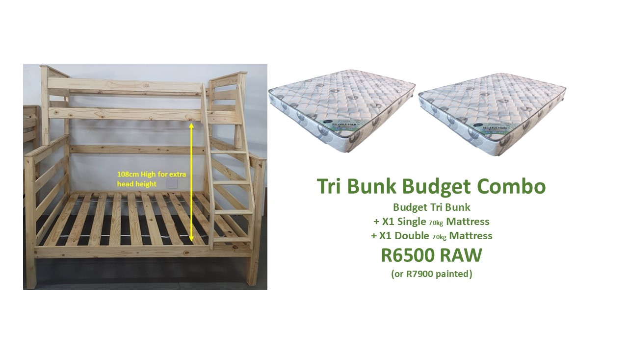 Painted – Combo consists of X1 Budget Tri Bunk painted in any of our finishes that is to be confirmed directly with the store + X1 Single 70kg Reliable Foam Mattress + X1 Double 70kg Reliable Foam Mattress